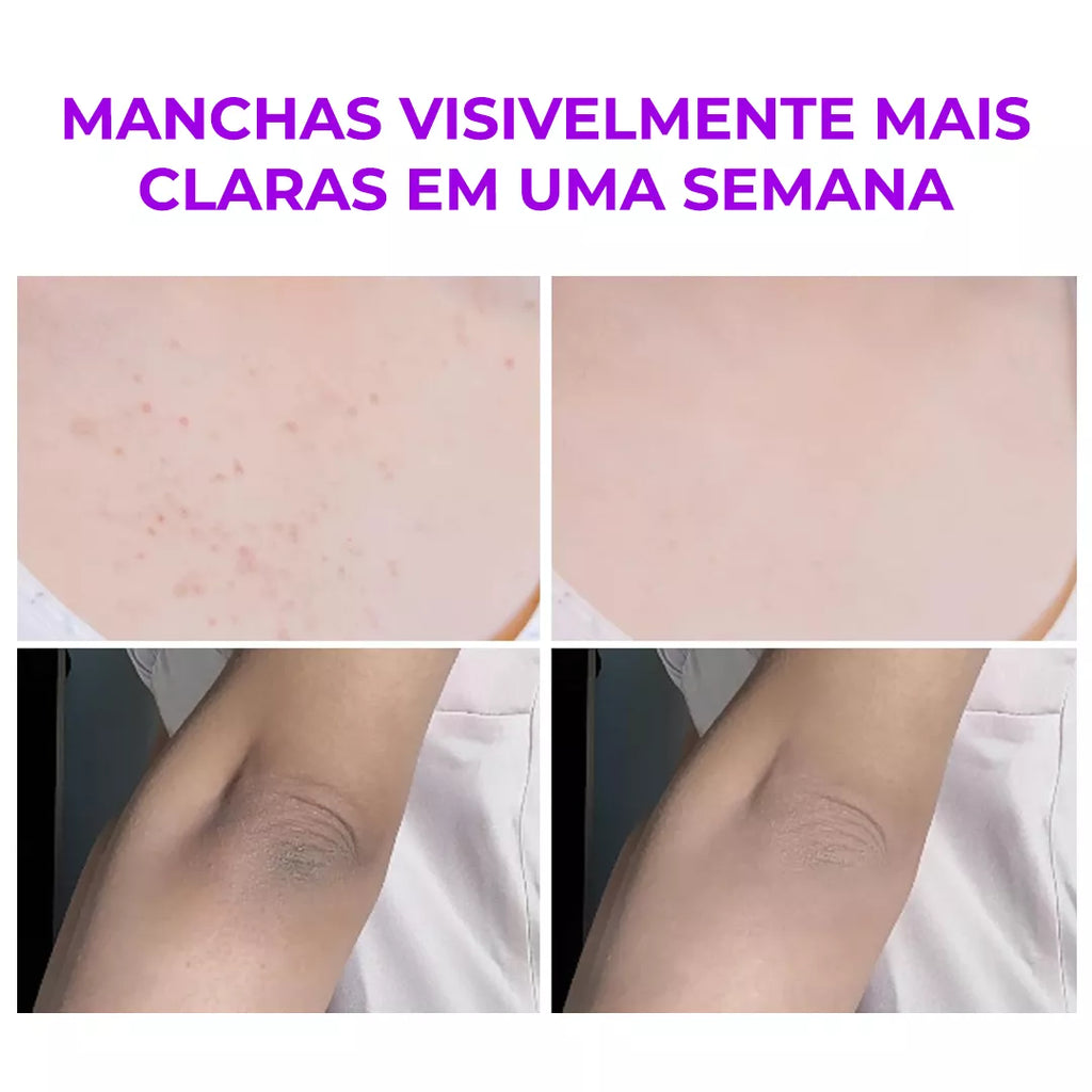 O Melashot atua direto na hiperpigmentação de áreas como virilhas, axilas, pescoço e joelhos. Seu alto poder clareador vem da combinação de Ácido Kójico e Cúrcuma, que atuam nas camadas mais profundas da pele, desbotando manchas escuras causadas por atrito, depilação ou melasma.